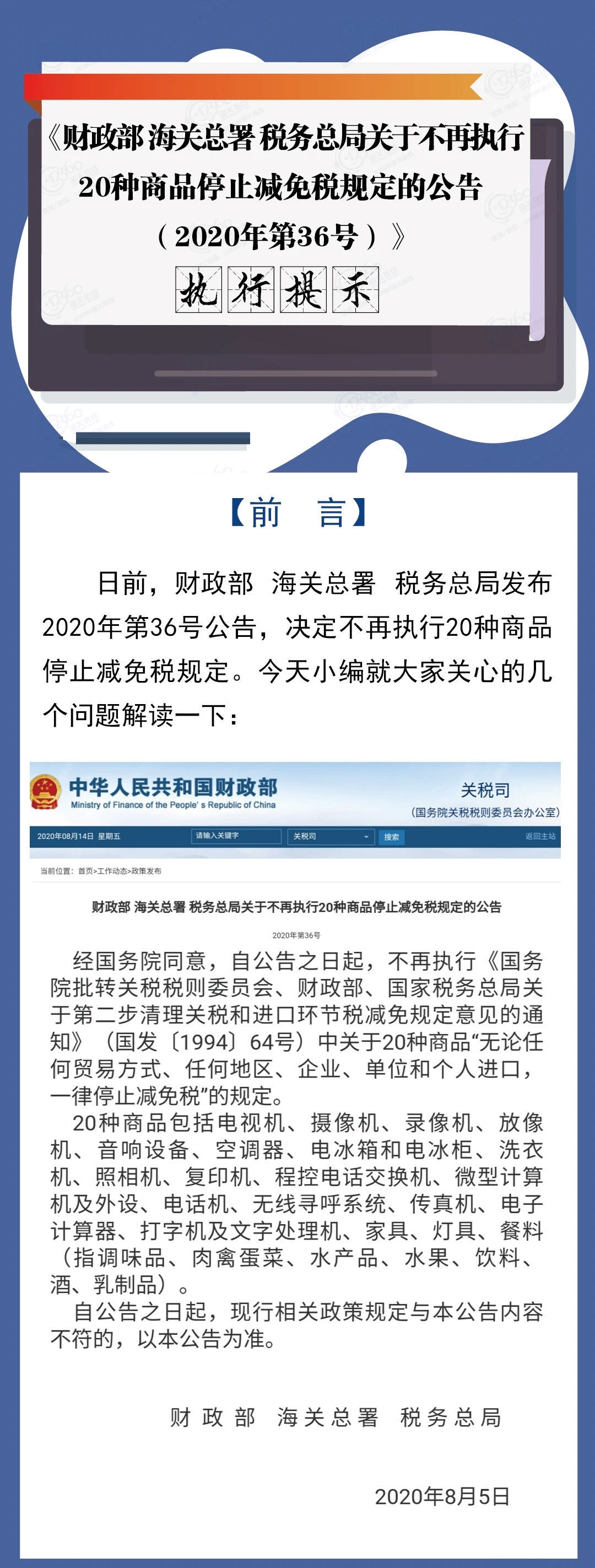 海關(guān)公告解讀:財政部 海關(guān)總署 稅務(wù)總局關(guān)于不再執(zhí)行20種商品停止減免稅規(guī)定的公告(2020年第36號)》執(zhí)行提示