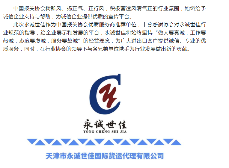 中國報關協(xié)會優(yōu)質服務商推薦 | 天津市永誠世佳國際貨運代理有限公司
