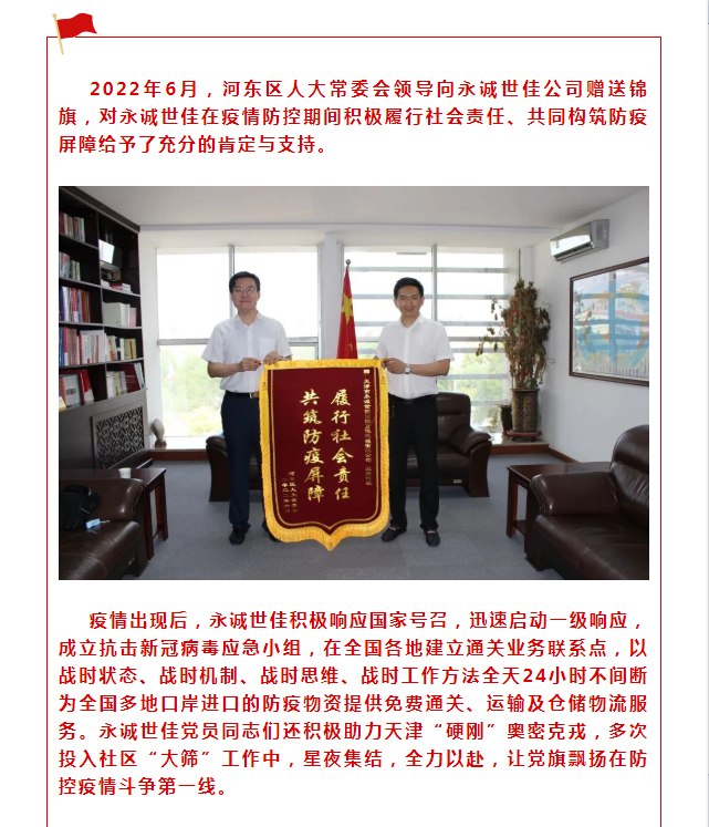 履行社會(huì)責(zé)任 共筑防疫屏障——河?xùn)|區(qū)人大常委會(huì)向永誠(chéng)世佳贈(zèng)送錦旗