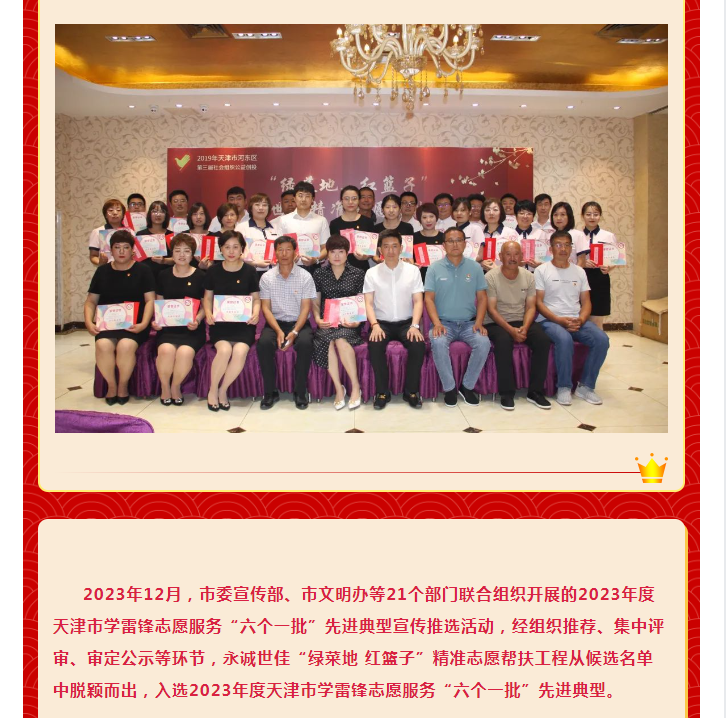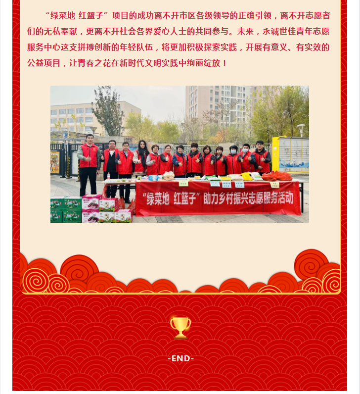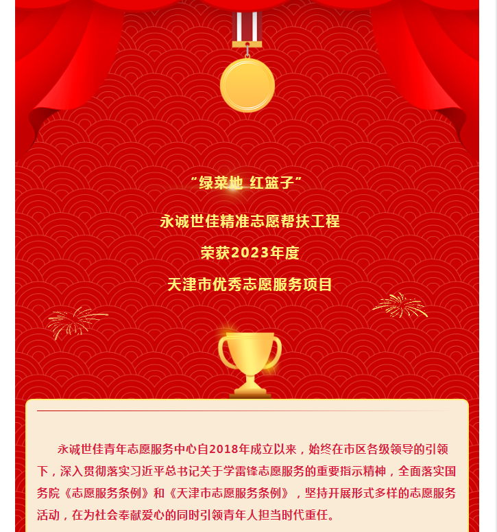 “綠菜地紅籃子”永誠(chéng)世佳精準(zhǔn)志愿幫扶工程榮獲2023年度天津市優(yōu)秀志愿服務(wù)項(xiàng)目