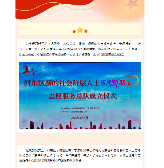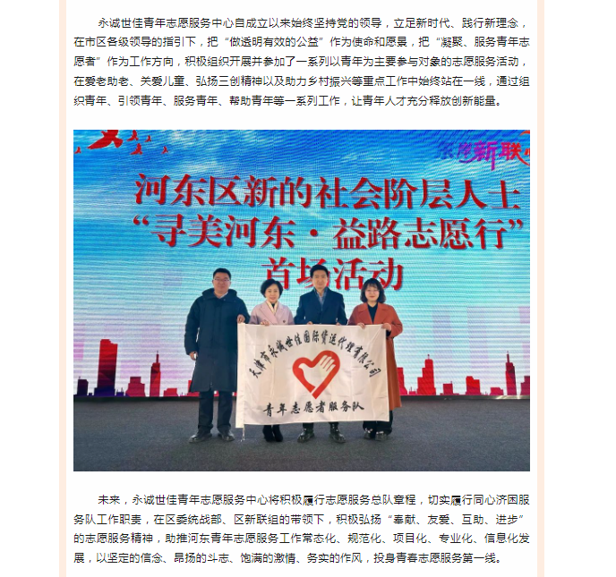 永誠(chéng)世佳青年志愿服務(wù)中心被聘為河?xùn)|區(qū)新的社會(huì)階層人士志愿服務(wù)總隊(duì)“東岸新聯(lián)心·牽手行動(dòng)”合作共建方