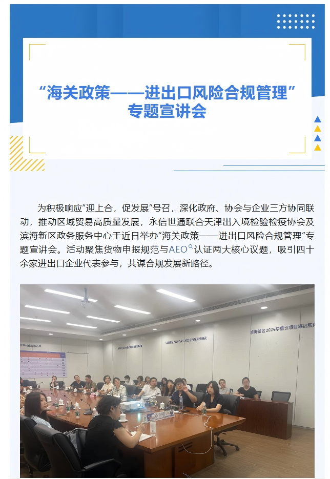 永信世通聯(lián)合天津出入境檢驗(yàn)檢疫協(xié)會(huì)及濱海新區(qū)政務(wù)服務(wù)中心舉辦“海關(guān)政策——進(jìn)出口風(fēng)險(xiǎn)合規(guī)管理”專題宣講會(huì)